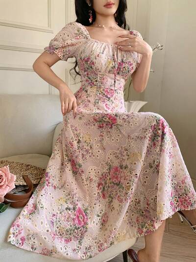 小花柄パフスリーブ リボンバックサンドレス ワンピース レディース イースター マキシ丈 ボヘミアン-38%