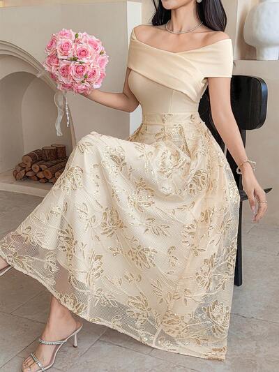 女性用エレガントな花柄パッチワーク アシンメトリーショルダー ロングドレス、夏のウェディングゲストドレス サンドレス カクテルドレス-25%