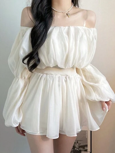 レディース エレガントな無地オフショルダー ランタンスリーブシャツ ウエストシェイプ 夏秋レディースウェア 長袖トップス キュートなトップス-41%