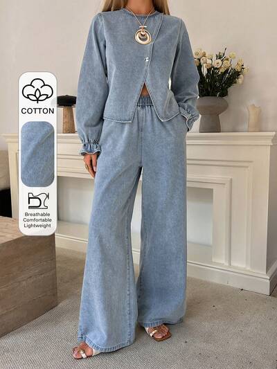 女性用カジュアル ウォッシュ加工 斜めカラー ラウンドネック ベルト付きシャツ&ワイドレッグジーンススーツ、春秋、結婚式ゲストドレス-30%