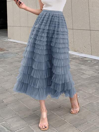 重ね合わせメッシュオーバーレイスカート ラッフル ロングスカート-43%