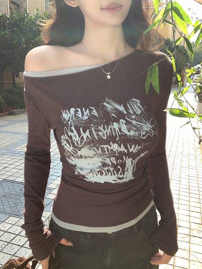 カラーブロック イングリッシュレター プリント アシンメトリーショルダー 長袖Tシャツ、春夏-52%