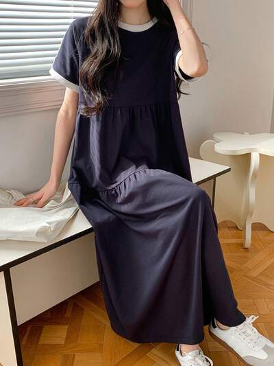 ウィメンズ ルーズ ラウンドネック ミドル丈ドレス、春夏マキシドレス-23%