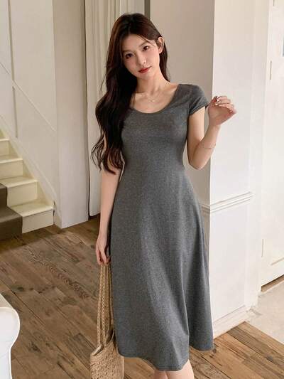 レディース 無地 ラウンドネック 半袖 ワンピース サマードレス、カジュアルな女性用ドレス-49%