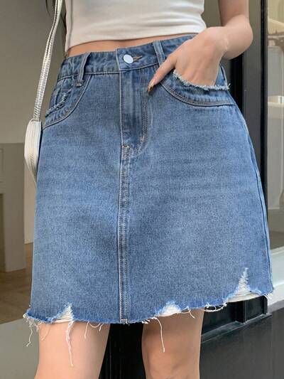 レディース フロントボタン ポケット フレイドヘム カジュアル デニムスカート ジーンズスカート-37%