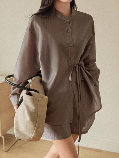 レースアップ フロントボタン シャツ&ショーツ 2点セット、オートムンビジネスカジュアルウーマン-30%