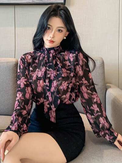 花柄オールオーバープリント長袖ゆったりネクタイ付きブラウストップス レディース、春夏のバカンスや秋のグラフィックTシャツに適しています-44%