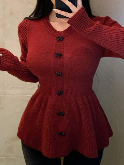 女性用フィットニットセーター、3Dリボンデコレーション、フリルヘム、ベリーカラー、クリスマス、新年、秋冬に適しています-27%