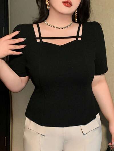 Dazy Plus 無地 半袖 非対称カラー ブラックTシャツ、夏用-35%