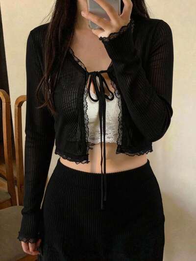 レース パネル ドローストリング タイ ロングスリーブ トップス アウトフィット、秋の女性服-30%