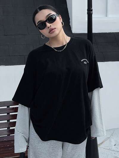 Dazy Plus カラーブロック パッチワーク レタープリント ルーズ ストリートウェア ラウンドネック プラスサイズ レディース Tシャツ、春/秋-44%