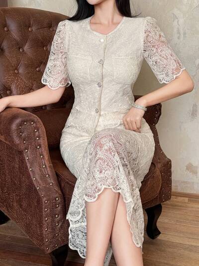 レディース エレガントレース ラウンドネック ポケット シャツ&スカート 2点セット、春夏、ウェディングゲストドレス-67%