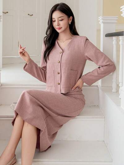 女性用無地ドロップショルダー長袖シングルブレスト シャツ&パンツ カジュアル 2点セット、秋のラウンジウェア-27%