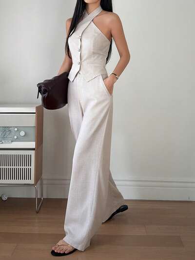 レディース夏用ホルターネック バックレス フィッティング クロップド ノースリーブタンクトップ&ルーズワイドレッグパンツ 2点セット、カジュアルアウトフィット-44%