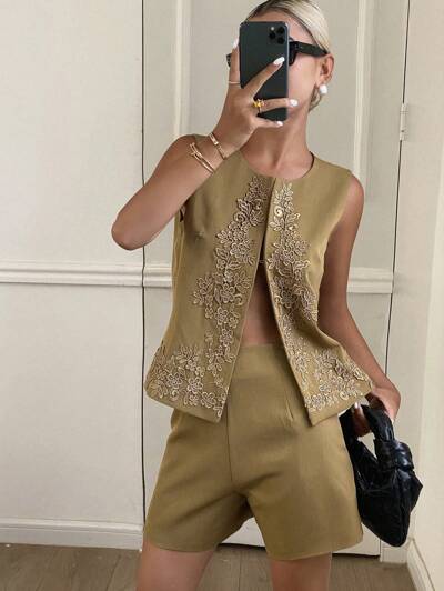 女性用無地ノースリーブ ホールアウトトップス&パンツ カジュアル 2ピースセット リネン素材-26%