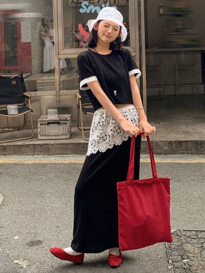 2枚セット レディース春夏パッチワーク クロップドTシャツ&スカートセット カーニバル-27%
