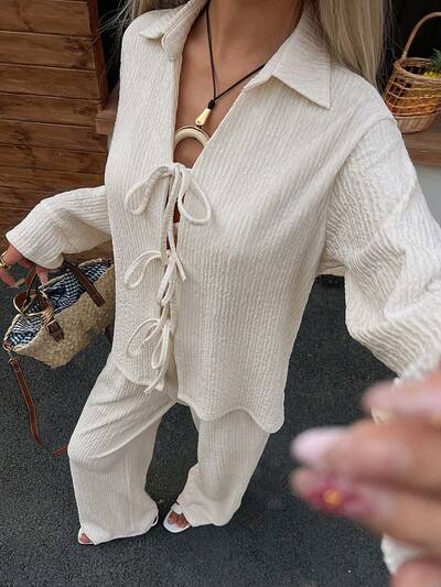 女性用カジュアルタイアップラップシャツとパンツ2点セット、秋-26%