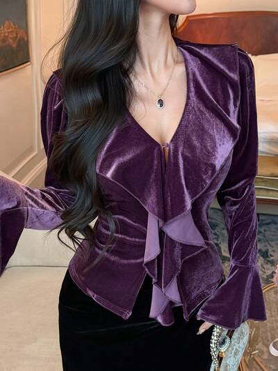 女性用エレガントな無地ラッフルフレアスリーブブラウス、秋冬長袖レディースお出かけトップス-60%