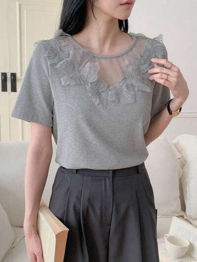ルーズ カジュアル レース パッチワーク 3Dフラワーデコレーション "Old Money" グレーTシャツ レディース、春夏、バレンタインデー、オフィスウェアに適しています-73%