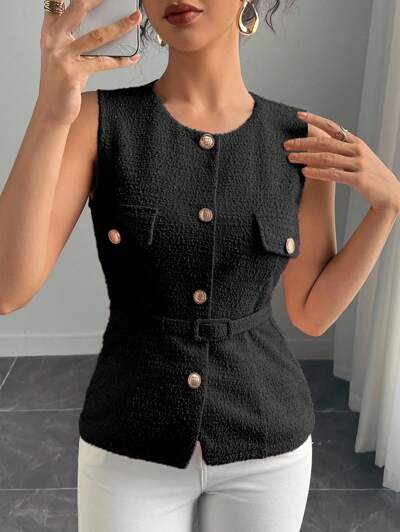 女性用ビジネスカジュアル テクスチャーニット 無地 ミニマリスト フリンジタンクトップ-33%