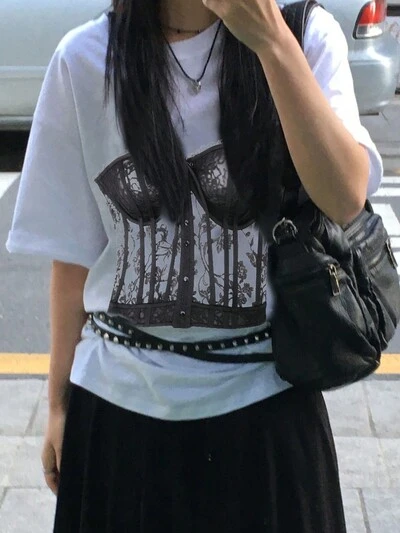 コントラストカラー スプライス 2in1 Vネック 半袖Tシャツ レディース サマー オールドマネー スタイル オーバーサイズ Tシャツ ティーチャー-65%