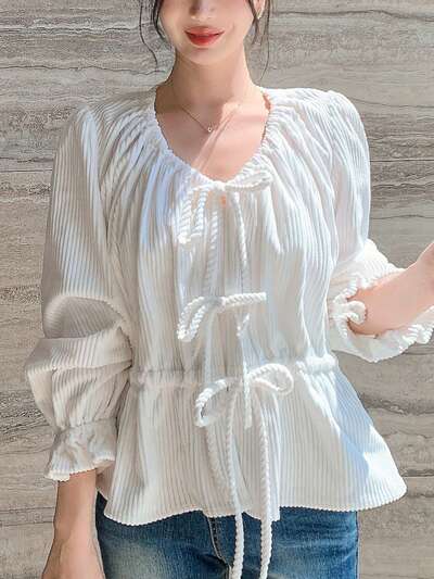 1個 レディース 無地コーデュロイ Vネック 長袖 ドローストリング ブラウス、フリル、秋服-65%