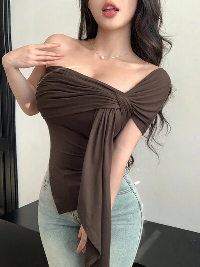 ウィメンズ ツイスト ディテール ボディコン アシンメトリー セクシー アシンメトリーネック Tシャツ オフショル-46%