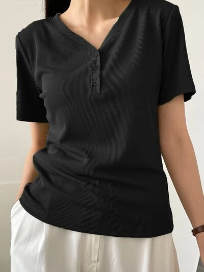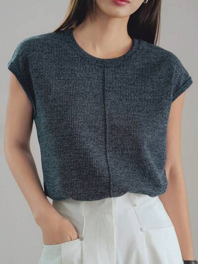 無地リブニットVネック半袖Tシャツ、オールドマネースタイル、夏のビジネスカジュアル、女性の仕事着