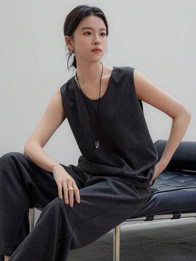 2点セット レディース 無地ミニマリスト ベストトップ ストレートレッグカジュアルパンツスーツ-60%