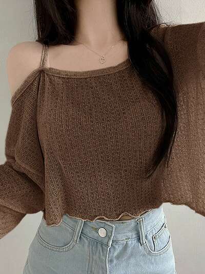 春夏用 レディース Vネック クロップド 半袖 テクスチャーニット セーター、サマーニット-38%