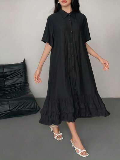 レディース エレガントなフリル襟 ゆったりミドル丈ドレス 夏用-47%