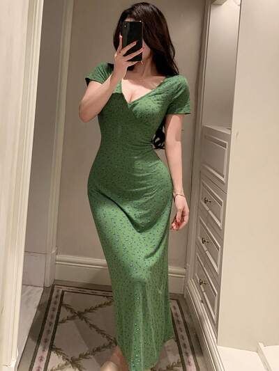 Vネック小花柄フィットサマーナイトガウン、レディースルームウェアドレス-43%
