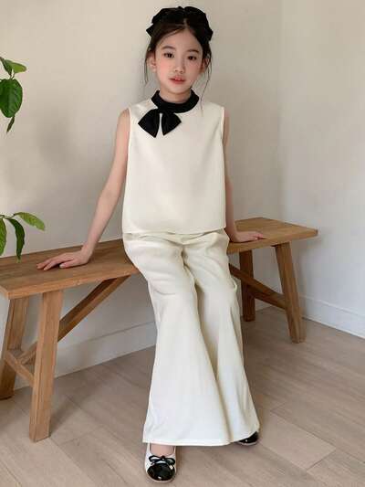 트윈 트윈걸 대비 컬러 리본 장식 탱크 탑 & 플레어 팬츠 2pcs 캐주얼 세트-60%