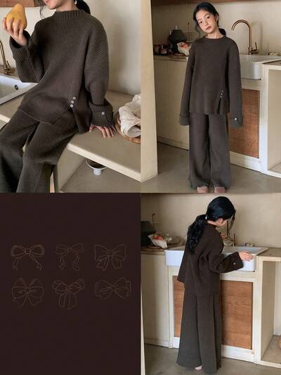 트윈 걸 솔리드 컬러 크루 넥 긴팔 스웨터 및 바지 캐주얼 복장-69%