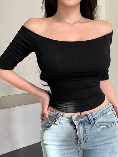 여성용 솔리드 컬러 러치드 오프 숄더 캐주얼 미드 슬리브 티셔츠 여름 외출 상의 여성-35%