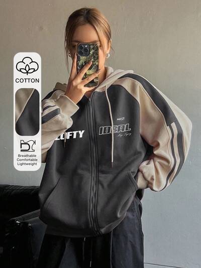 여성 봄 가을 캐주얼 컬러 블로킹 후드 티셔츠, 레터 프린팅 및 드로스트링, 긴 소매 탑, 가을 여성 의류 재킷 지퍼 업-51%
