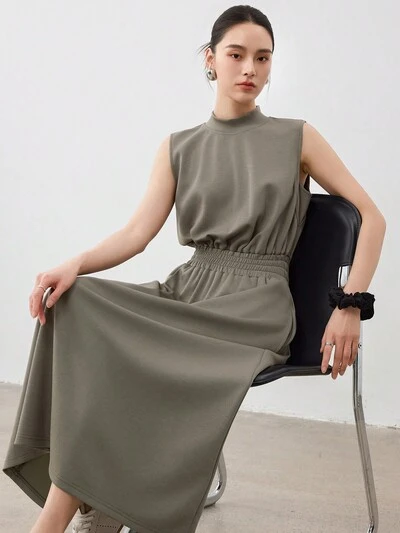 비즈니스 캐주얼 디자인 허리 핀치 심플 솔리드 컬러 민소매 미디 원피스 여성용 선드레스-60%