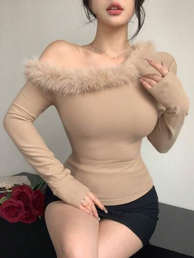 여성용 퍼지 퍼 칼라 패치워크 비스듬한 숄더 긴소매 티셔츠, 가을/겨울, 새해, 크리스마스 Y2k에 적합-33%