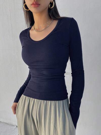 여성용 타이트 핏 티셔츠, 큰 라운드 네크라인, 가을 의류, 학교 복귀 의류, 긴팔 여성 탑스-32%