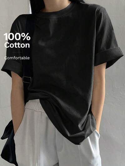 루즈핏 캐주얼 라운드 넥 여름용 솔리드 컬러 오버사이즈 티셔츠-49%