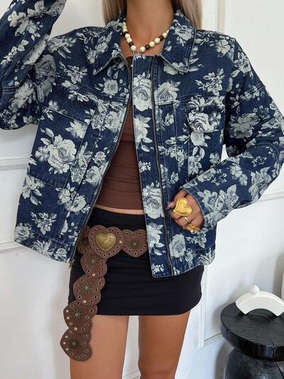 Women's Floral Print Lapel Loose Short Denim Jacket-73%