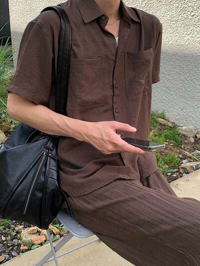 Men's Solid Color Short Sleeve Shirt And Shorts Set, Summer-50%