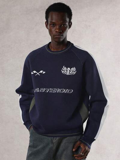 Men's Letter Jacquard Side Seam Splice Design Crew Neck Sweater, Navy Blue, Autumn-60%