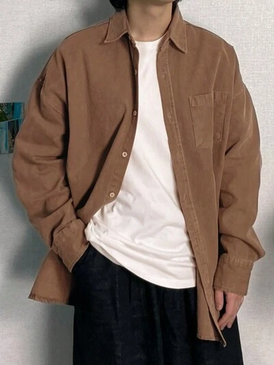 1pc Men's Solid Color Front Button Pocket Casual Long Sleeve Baggy Shirt,Fall Clothes-61%