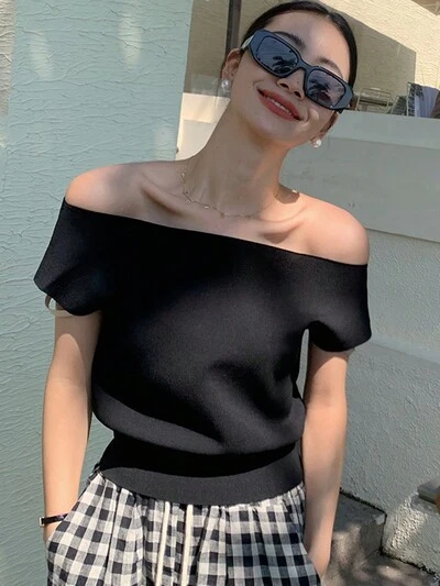 Ladies' Solid Color Off-Shoulder Short-Sleeved Knitted Top-39%