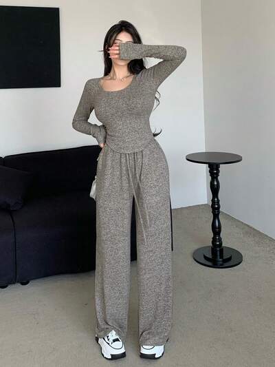Women's Slim Fit Round Neck Long Sleeve T-Shirt And Loose Straight Pants Summer,Women Two Pieces Sets,Back To School Clothes Lounge Sets For Women-38%