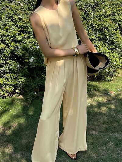 Women's Casual Solid Color Sleeveless Top And Wide Leg Pants 2 Pieces Set, Summer
