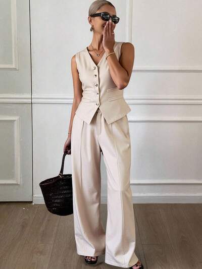 Women's Solid Color Single-Breasted Vest And Pleated Wide-Leg Pants Casual 2 Pieces Set Summer-26%