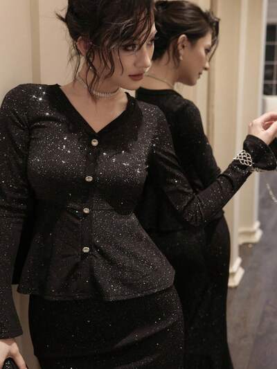 Women's Elegant Sequin V-Neck Ruffle Blouse And Fish Tail Skirt 2 Pieces Set, Autumn-62%
