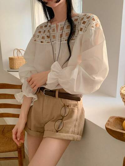 Women's Solid Color Minimalist Everyday Lace Patchwork Long Sleeve Shirt-32%